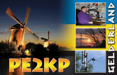 Maar goed, hier boven zie je dus mijn QSL kaart. De voorzijde en achterzijde. Op de voorkant zie je rechts de drie kleur van Gelderland: Blauw. geel en zwart. Verder een plaatje van mijn dipool antenne, en een plaatje van mijzelf. Dan de rest zijn plaatjes van ons schone land. Een zonsondergang en een paar molens. Op de achterkant zie je de stoomtrein die van Apeldoorn naar Dieren loopt over de rails. Op die kant worden dan de verbinding gegevens geschreven.